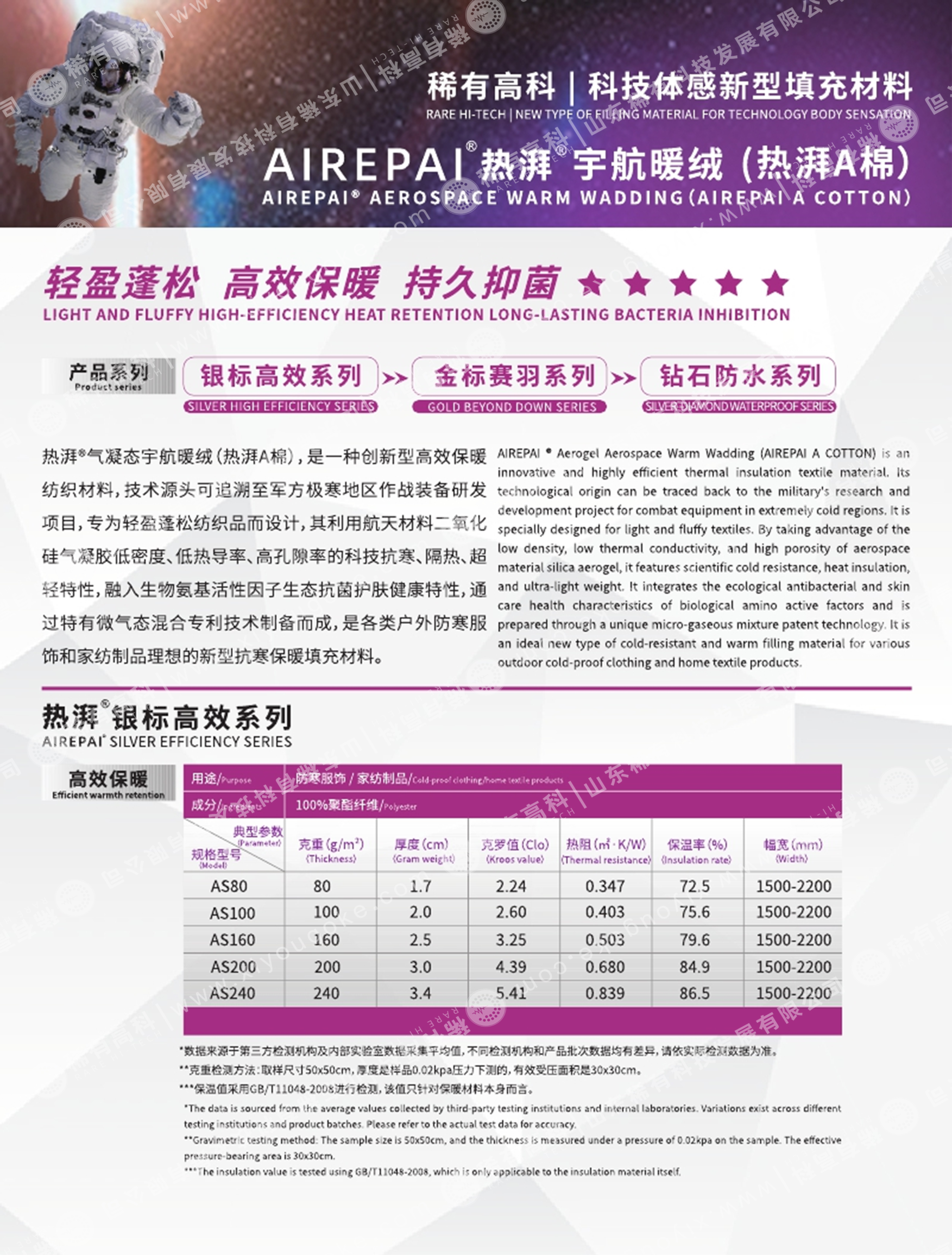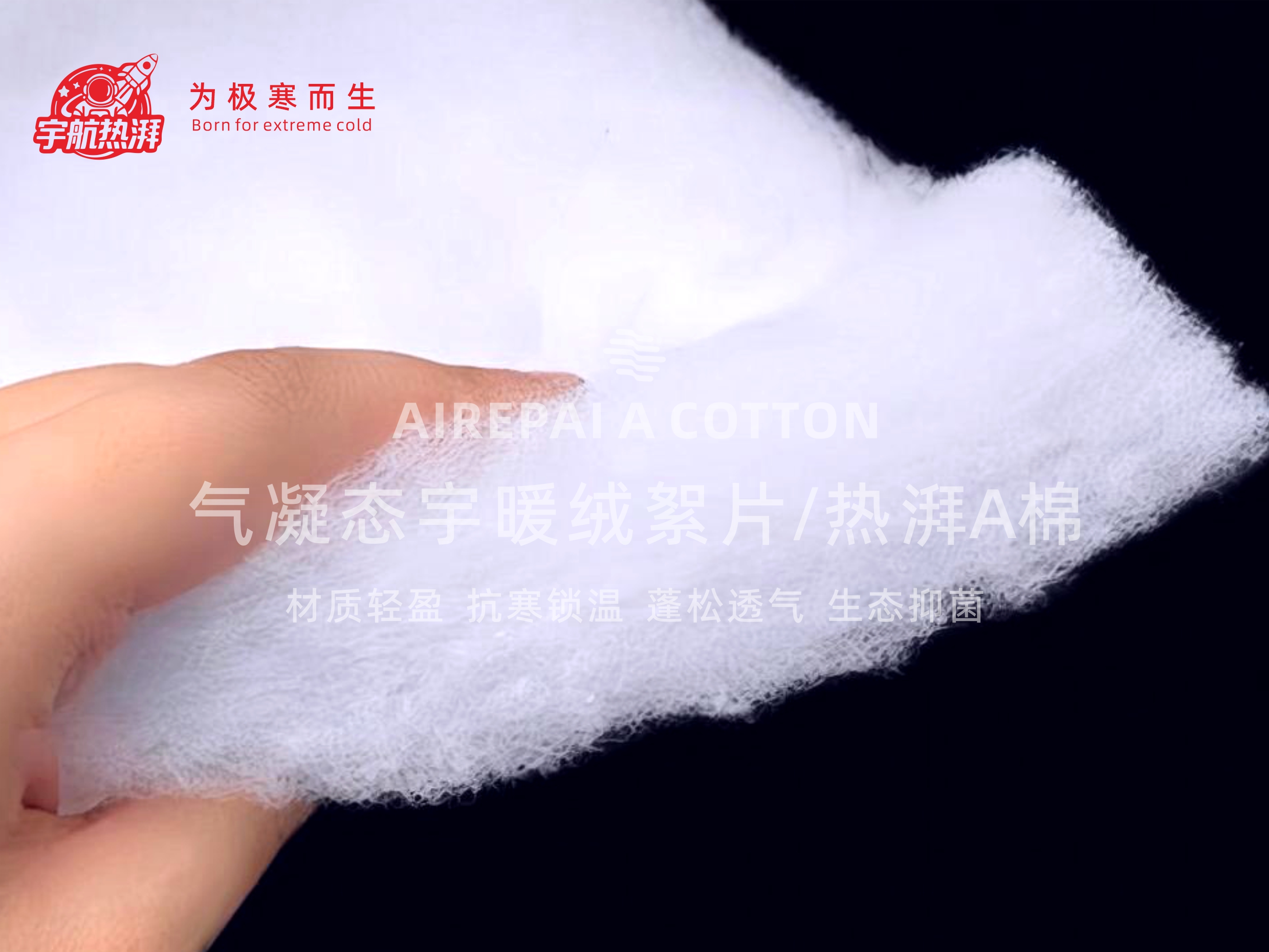 AIREPAI ® Aerogel Aerospace Warm Wadding (AIREPAI A COTTON) is an innovative and highly efficient thermal insulation textile material. Its technological origin can be traced back to the military's research and development project for combat equipment in extremely cold regions. It is specially designed for light and fluffy textiles. By taking advantage of the low density, low thermal conductivity, and high porosity of aerospace material silica aerogel, it features scientific cold resistance, heat insulation, and ultra-light weight. It integrates the ecological antibacterial and skin care health characteristics of biological amino active factors and is prepared through a unique micro-gaseous mixture patent technology. It is an ideal new type of cold-resistant and warm filling material for various outdoor cold-proof clothing and home textile products.