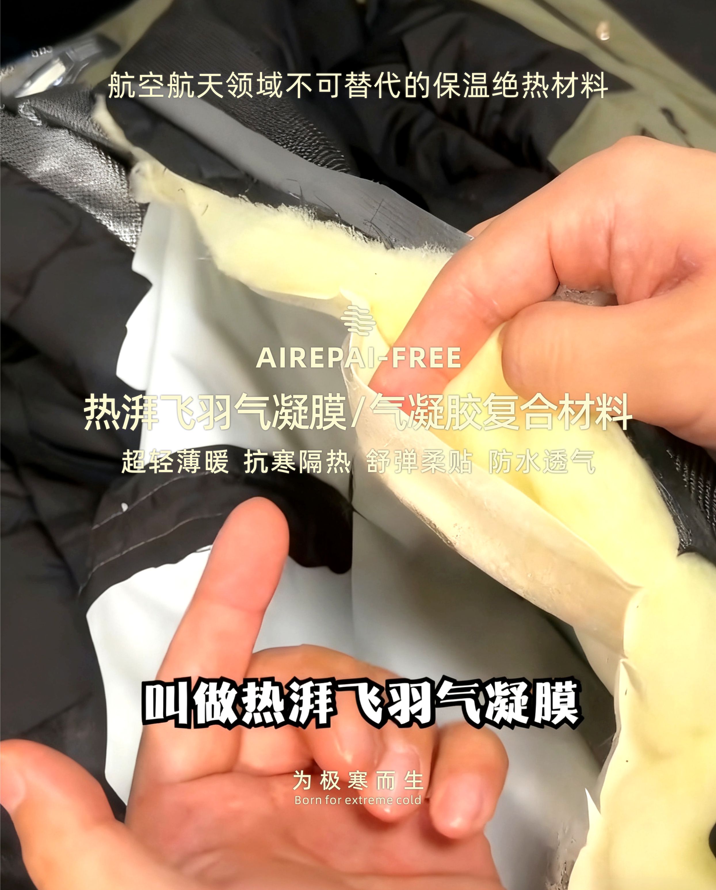 Cold-proof jacket: 1mm AIREPAI-FREE aerogel film is embedded in the inner layer of the jacket to form an ultra-thin thermal insulation layer, featuring lightness, cold resistance, and a combination of fashion and technological warmth retention.