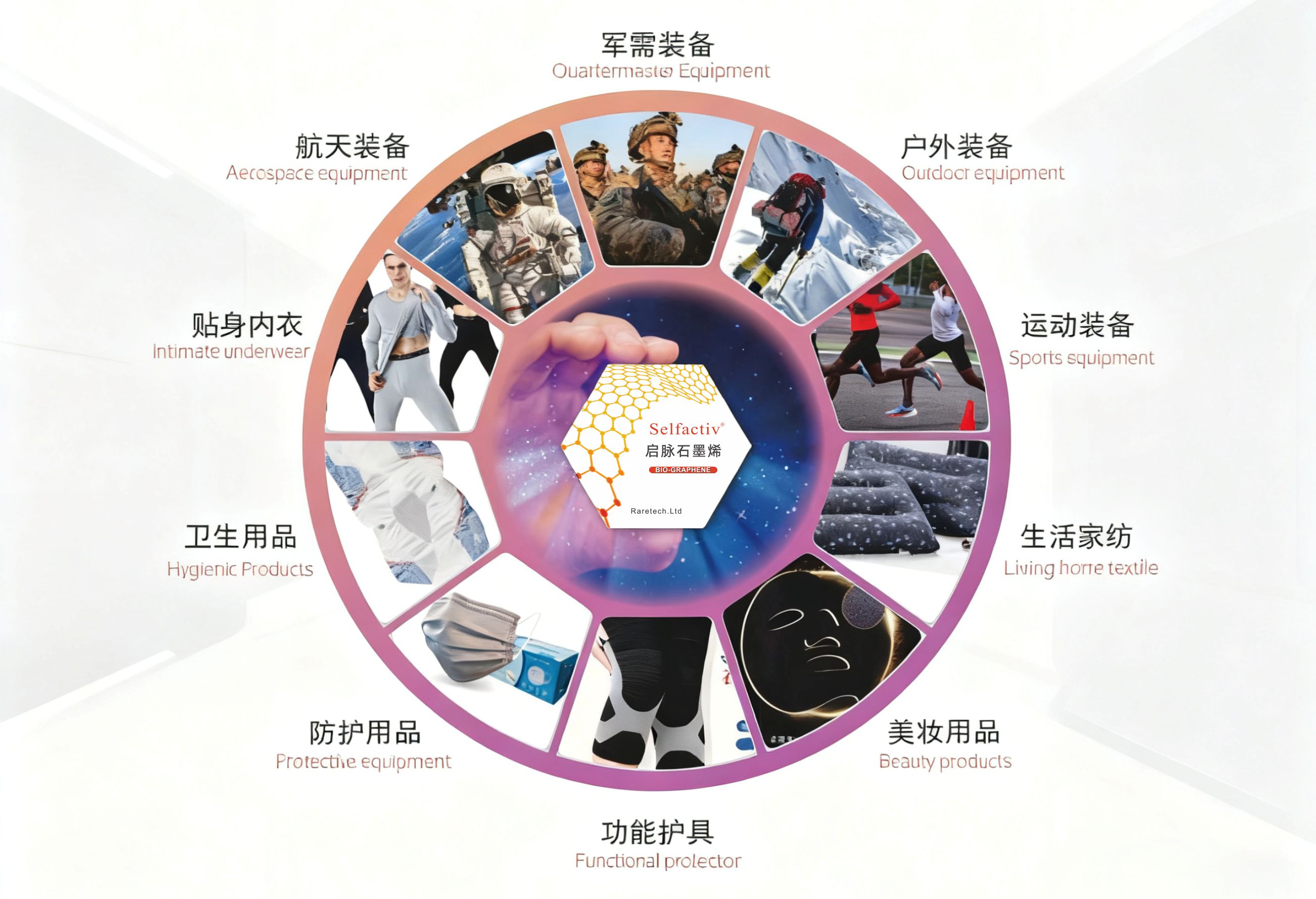 Self-Active graphene superconducting fibers/yarns are widely used in various product fields such as special equipment, aerospace equipment, outdoor equipment, sportswear, intimate underwear, home textiles, hygiene products, protective equipment, beauty products, and functional protective gear.