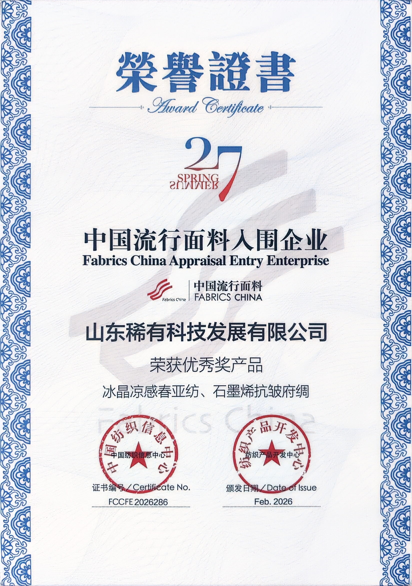 近日,2026中国国际面料设计大赛暨第55届(2027春夏)中国流行面料入围评审结果揭晓,山东稀有科技发展有限公司(稀有高科)《冰晶凉感春亚纺》与《石墨烯抗皱府绸》两款创新产品荣获中国流行面料优秀奖,用科技实力续写纺织新材料领域的精彩篇章。