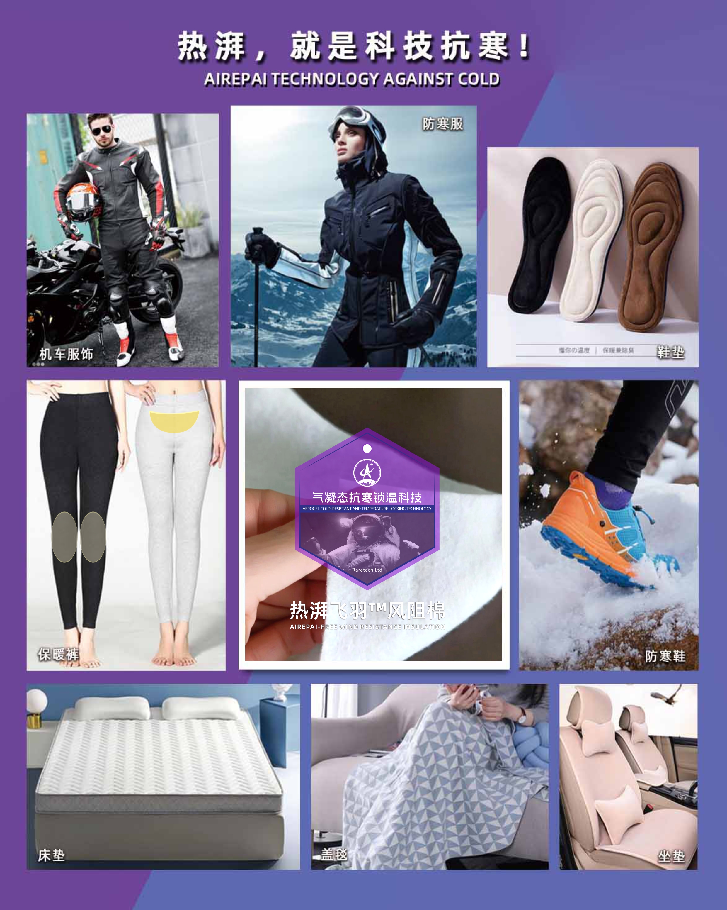 AIREPAI-FREE™ Wind resistant cotton is an innovative product of ultra-thin technology and cold resistance launched by Shandong Rare Science and Technology Co., Ltd. It uses the technological cold resistance, heat insulation and ultralight characteristics of aerospace material silicon dioxide aerogel, such as low density, low thermal conductivity and high porosity, integrates double anti expansion acrylic fiber and plant wormwood fiber, and combines nonwoven superposition technology. It integrates multiple warm and healthy skin care characteristics, such as light, soft, cold resistant and heat storage, far-infrared temperature rise, bacteriostasis and acarid prevention, skin friendly and breathable, providing excellent ultra-thin heat preservation solutions for autumn and winter clothing and cold resistant textiles, and has the advantages of natural environmental protection and infant safety level. This product combines multiple features including being light and soft, cold-resistant and heat-retentive, capable of far-infrared heating, antibacterial and anti-mite, as well as skin-friendly and breathable. It offers an outstanding ultra-thin thermal insulation solution for autumn and winter clothing and cold-resistant textiles. Moreover, it has the advantages of being naturally environmentally friendly and meeting the safety standards for infants.