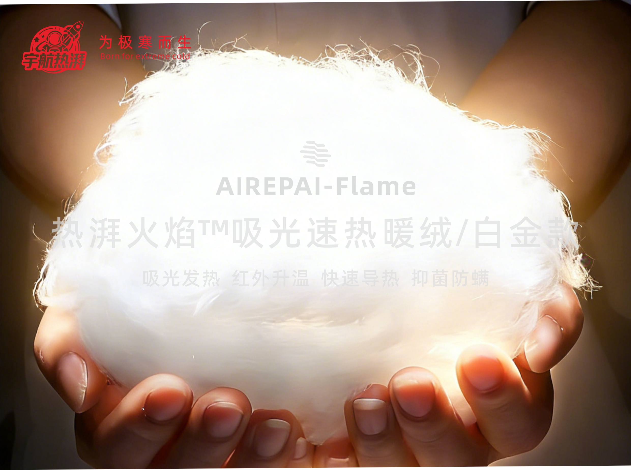 Light Absorption and Rapid Heating Insulation (Airepai Flame Platinum), Based on the "Airepai® Heat Retaining and Anti-Bacterial Fiber" product selected by the Chinese Fiber Fashion Trend, which is innovatively developed, it integrates heating, heat retention, light weight, and antibacterial properties. It is specially designed for consumers who pursue efficient warmth and quality of life. The product achieves efficient conversion of light energy into heat through unique bioactive factors, aerogel nano-porous structure and irregular hollow structure. It forms stable air cavities within the tissue, achieving heat retention performance comparable to down, without the drawbacks of down losing warmth and losing its antibacterial properties due to water washing and generating unpleasant odors. It provides a completely new and highly efficient solution for the warmth needs in cold environments.