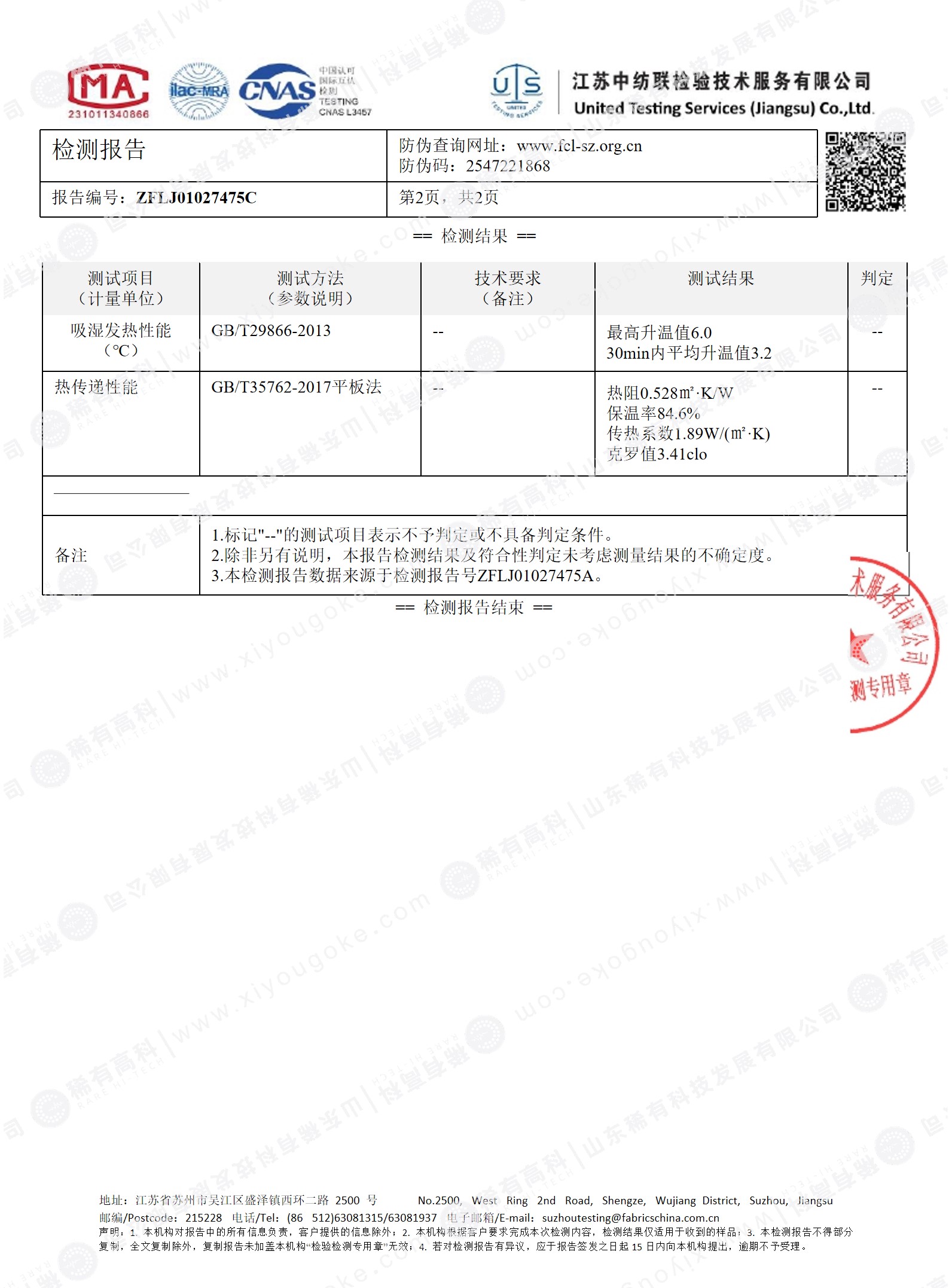 吸湿速热中棉吸湿发热/保暖性能检测报告: