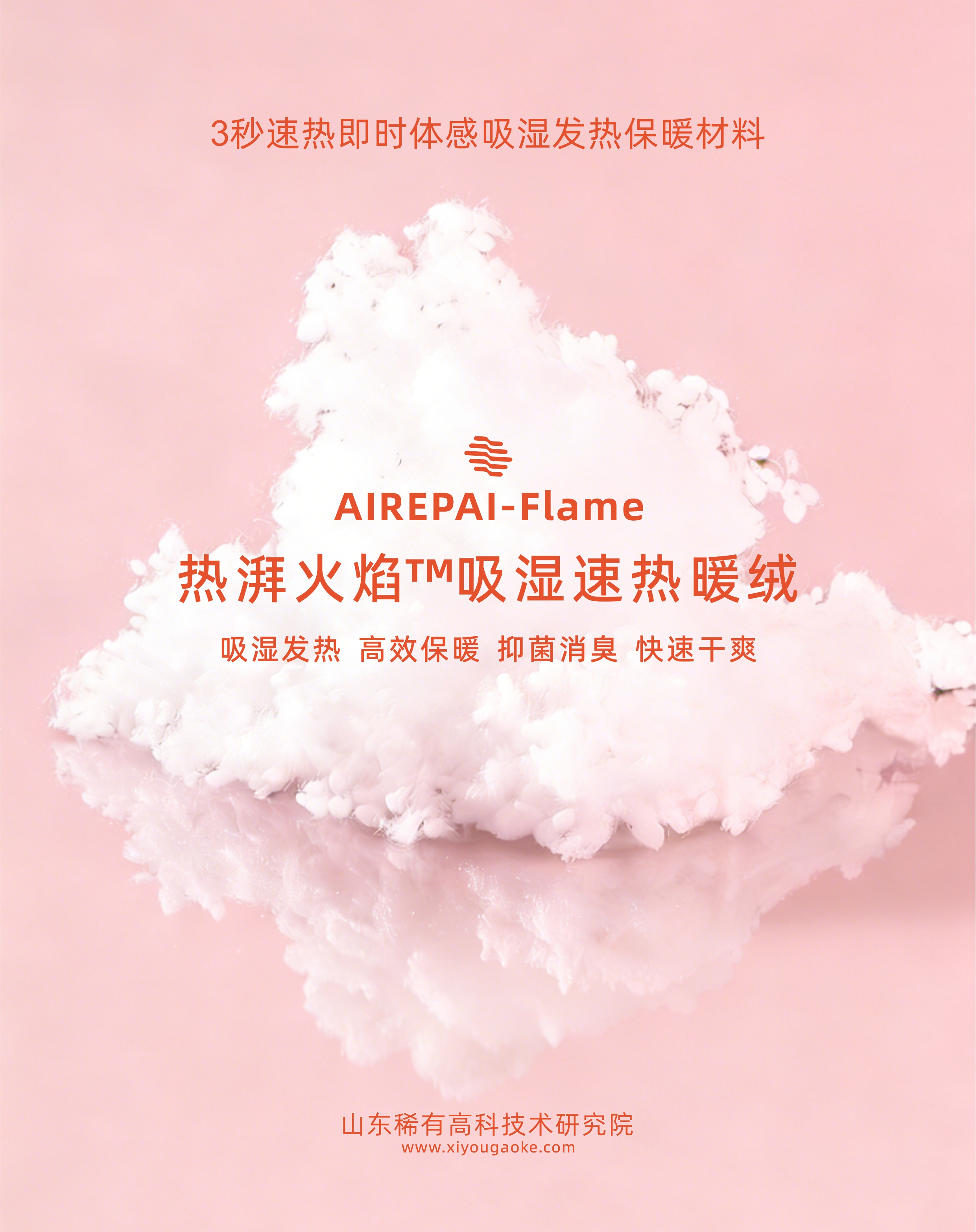 Airepai-Flame moisture-absorbing insulation, relying on the body's own water vapor for passive heat generation without external energy, is energy-saving and environmentally friendly. It exhibits outstanding washability and a service life far exceeding traditional thermal materials. It can be widely applied to thermal underwear, loungewear, outdoor clothing, and other categories, suitable for daily commuting, outdoor travel, and home leisure. It provides users with a professional autumn and winter thermal solution that offers "instant warmth, lasting comfort, and long-term cleanliness," balancing functionality and comfort, and showcasing the technical advantages of high-end functional thermal materials.